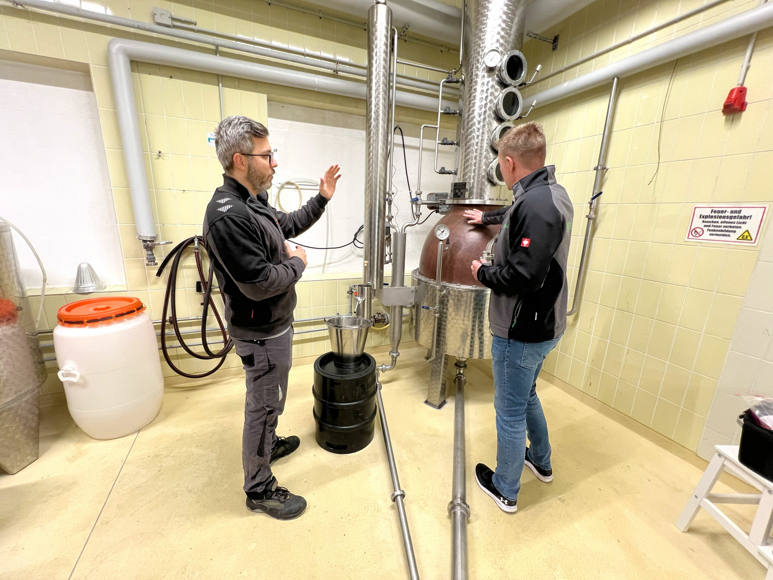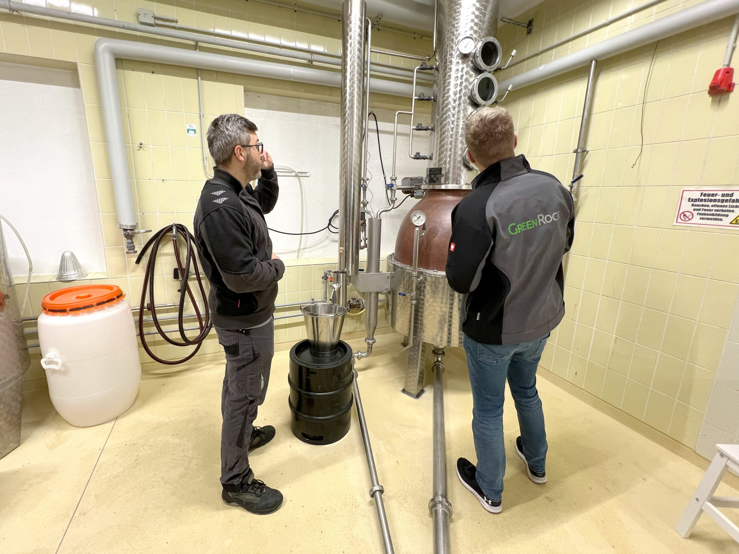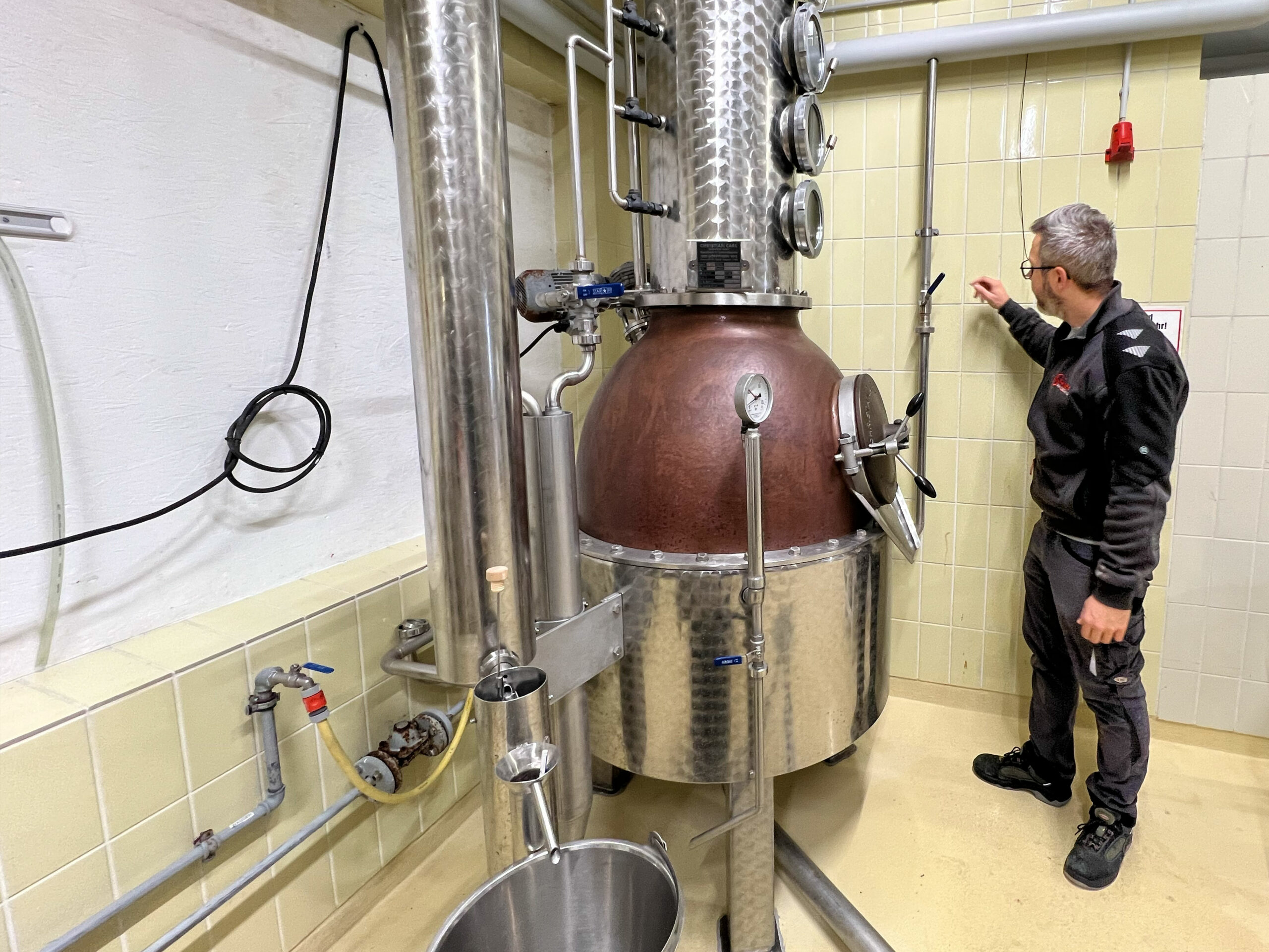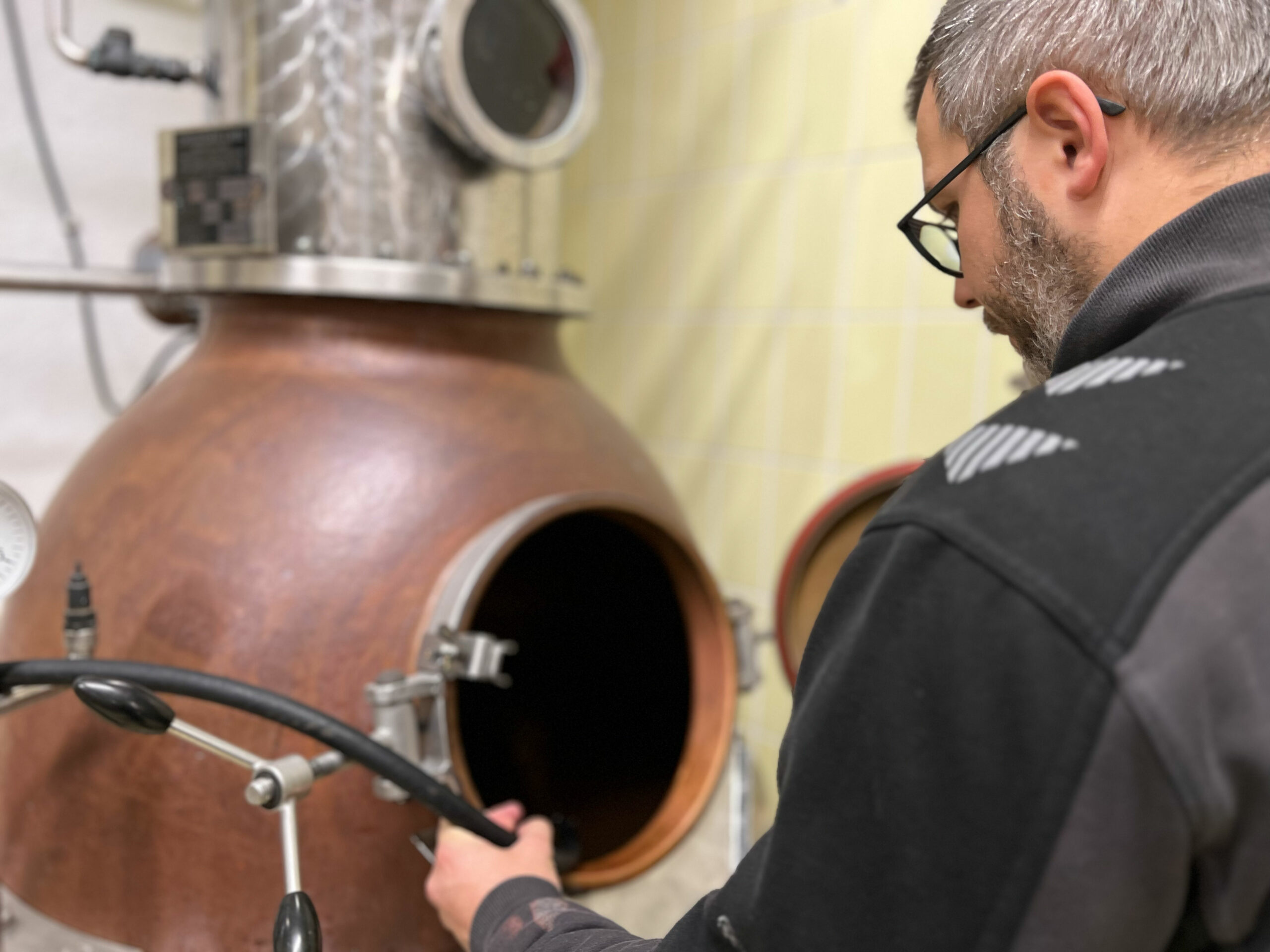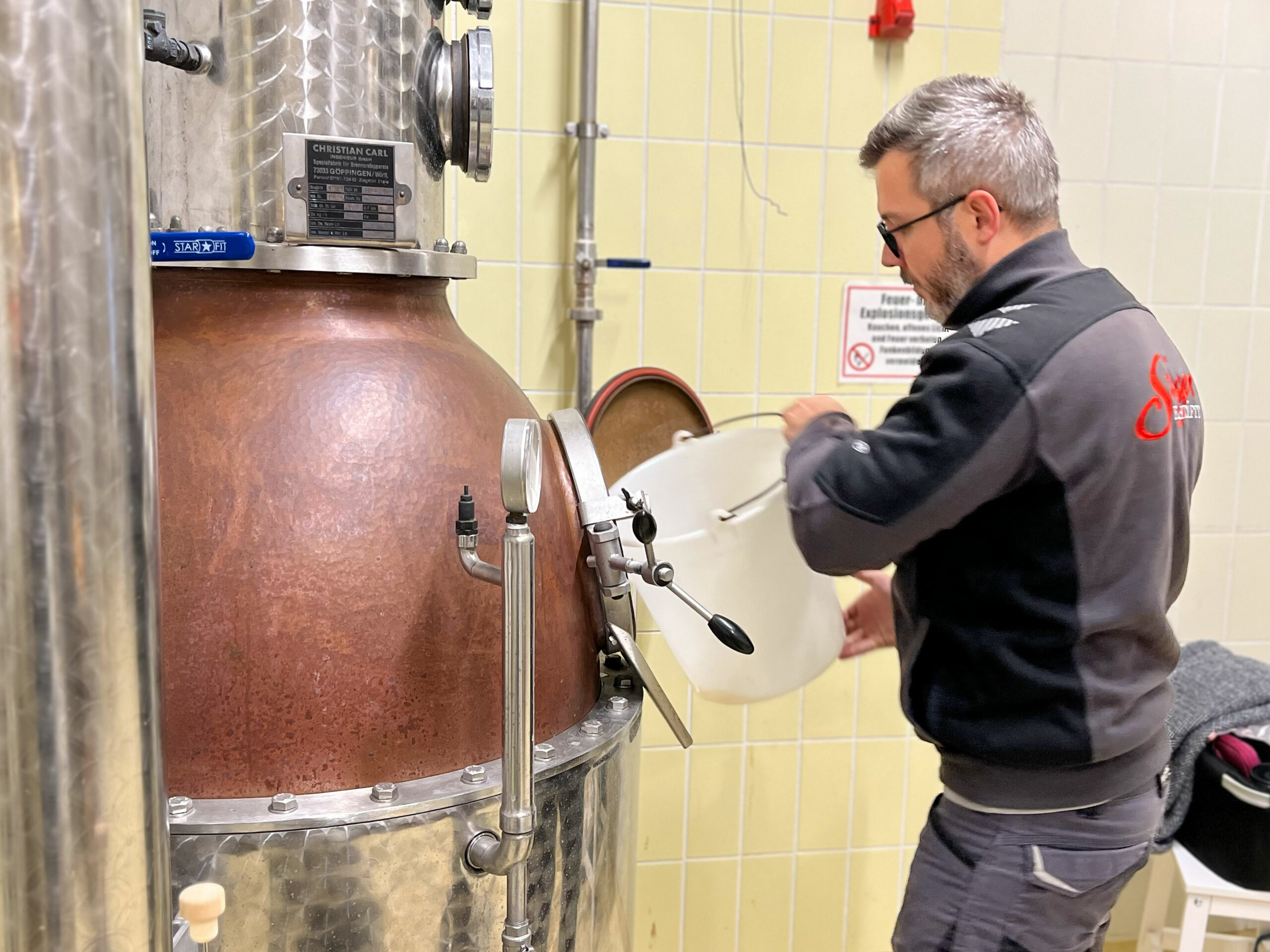 Jeder Schritt – vom Abwiegen der Zutaten über das Befüllen der Kupferbrennblase bis hin zur genauen Überwachung des Destillationsprozesses – wurde mit höchster Präzision ausgeführt. Die Liebe zum Detail war in jedem Moment spürbar.