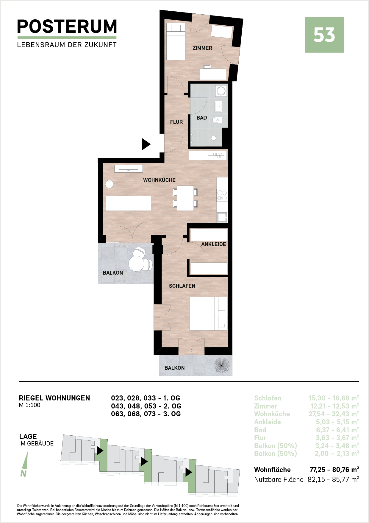 Diese moderne 3-Zimmer-Wohnung im POSTERUM besticht durch einen großzügigen, durchdachten Grundriss und zwei Balkone, die zusätzlichen Wohnkomfort bieten. Die helle Wohnküche bildet den Mittelpunkt der Wohnung und öffnet sich zu einem der Balkone – ideal für entspannte Momente im Freien. Das große Schlafzimmer verfügt über eine praktische Ankleide sowie Zugang zum zweiten Balkon. Ein weiteres Zimmer eignet sich perfekt als Kinder-, Arbeits- oder Gästezimmer. Das moderne Bad und der einladende Flur runden das Angebot ab. Ideal für Paare und kleine Familien, die Wert auf Qualität und Freiraum legen.