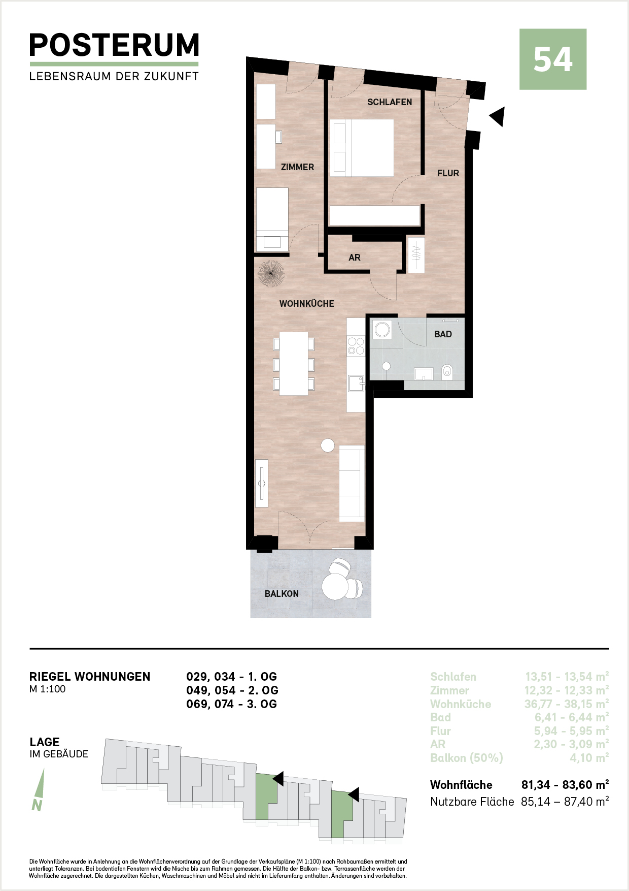 Diese moderne 3-Zimmer-Wohnung bietet einen großzügigen Wohn-/Essbereich mit offener Küche und Zugang zum Balkon. Das Schlafzimmer liegt ruhig, das zweite Zimmer eignet sich ideal als Büro oder Gästezimmer. Ein helles Tageslichtbad sowie ein praktischer Abstellraum ergänzen den funktionalen Grundriss. Große Fenster schaffen ein angenehmes Wohnambiente. Im POSTERUM entsteht ein zukunftsorientiertes Wohnkonzept mit hoher Lebensqualität – ideal für Menschen, die Komfort, Raum und moderne Architektur schätzen.