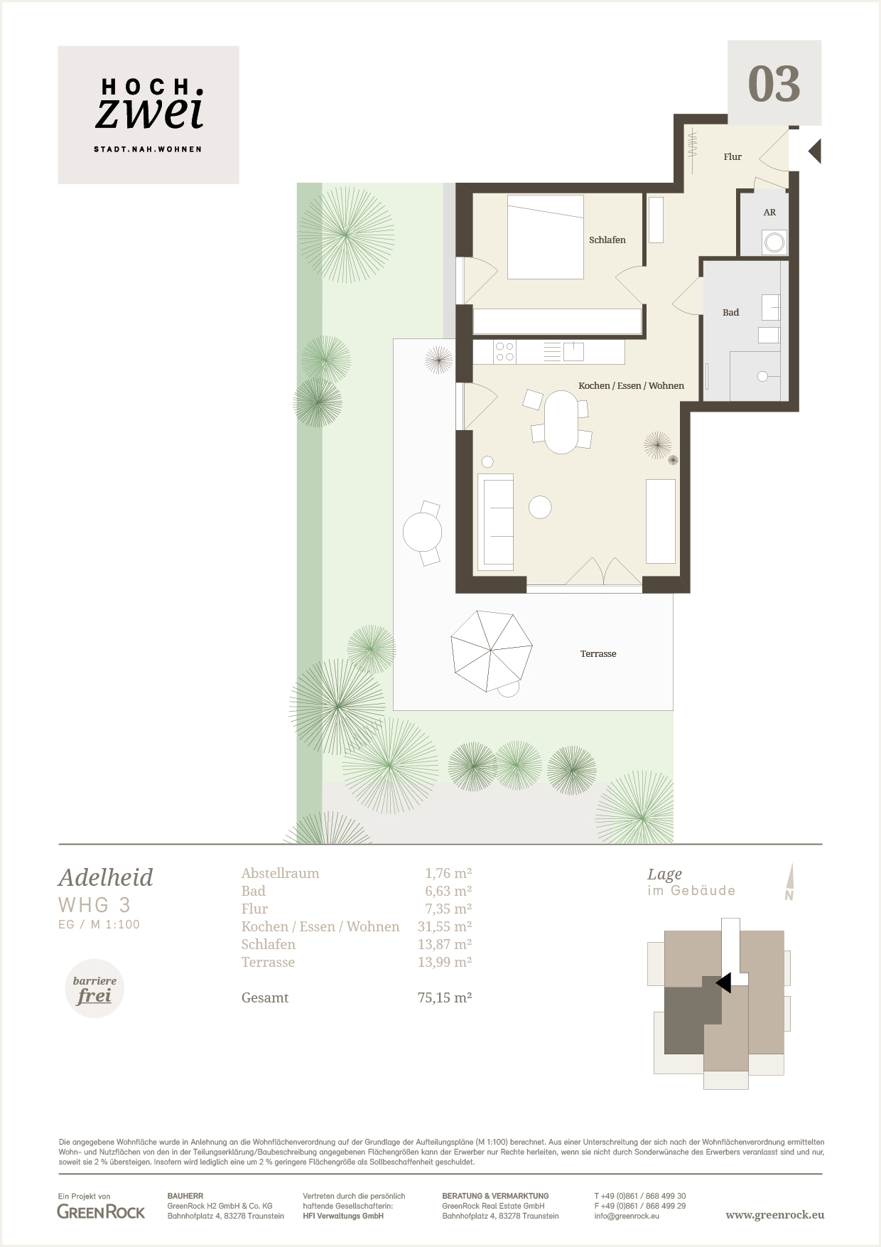 Diese hochwertige Wohnung überzeugt durch ihren offenen Wohn-/Ess-/Kochbereich, der viel Licht und eine großzügige Raumwirkung bietet. Das gemütliche Schlafzimmer liegt ruhig im hinteren Bereich. Ein modernes Bad sowie ein praktischer Abstellraum ergänzen die durchdachte Grundrissgestaltung. Highlight ist die weitläufige Südterrasse mit Blick ins Grüne – ideal zum Entspannen und Genießen. Die Wohnung liegt zentrumsnah, dennoch ruhig, und eignet sich perfekt für Singles oder Paare. Gesamtfläche ca. 75 m².