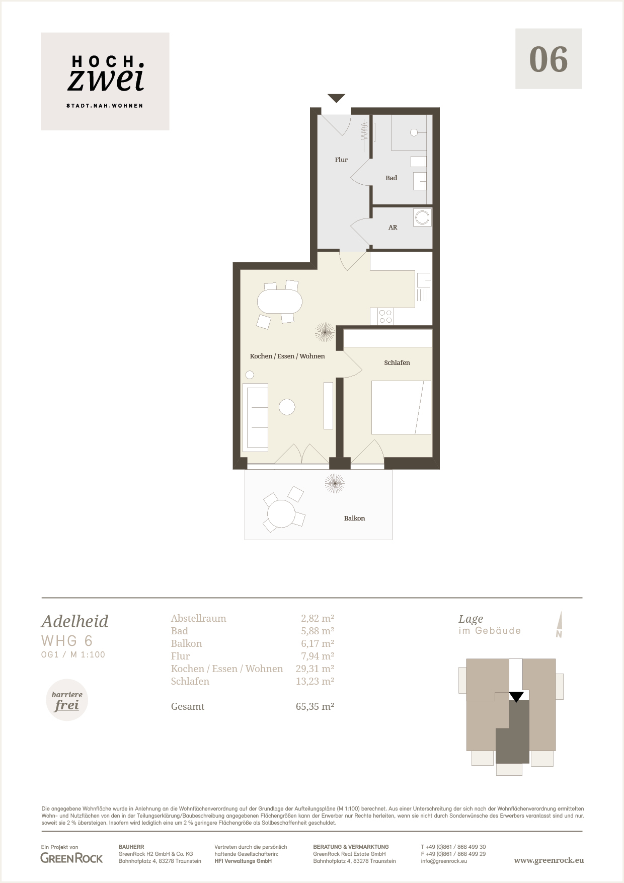 Die barrierefreie 2-Zimmer-Wohnung im 1. Obergeschoss bietet einen funktionalen Grundriss und einen großzügigen Wohn-, Ess- und Kochbereich. Das Schlafzimmer ist gut geschnitten und ermöglicht eine komfortable Möblierung. Das moderne Bad sowie ein praktischer Abstellraum sorgen für zusätzlichen Komfort im Alltag. Der Balkon erweitert den Wohnraum nach außen und lädt zu entspannten Stunden ein. Mit insgesamt 65,4 m² Wohnfläche eignet sich die Wohnung ideal für Singles oder Paare, die eine ruhige und gut angebundene Lage schätzen.
