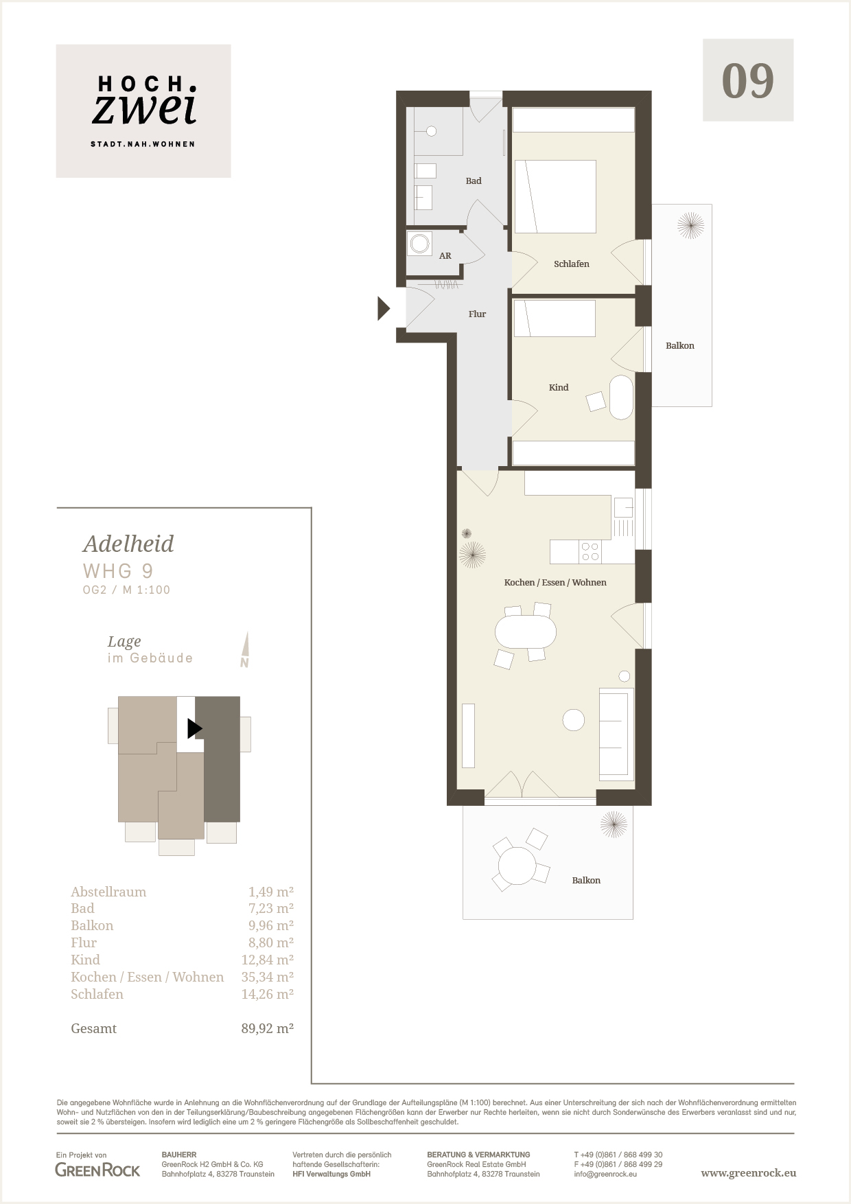 Die gut strukturierte 3-Zimmer-Wohnung im 2. Obergeschoss bietet mit 89,92 m² ein komfortables Raumangebot. Der große Wohn-, Ess- und Kochbereich bildet das Herzstück der Wohnung und öffnet sich zu einem der beiden Balkone. Zwei weitere Zimmer eignen sich ideal als Schlafzimmer, Kinderzimmer oder Homeoffice. Das moderne Bad sowie ein praktischer Abstellraum ergänzen die funktionale Ausstattung. Beide Balkone erweitern den Wohnraum und schaffen schöne Außenbereiche. Die Wohnung liegt in einer angenehm ruhigen, dennoch gut angebundenen Wohnanlage.