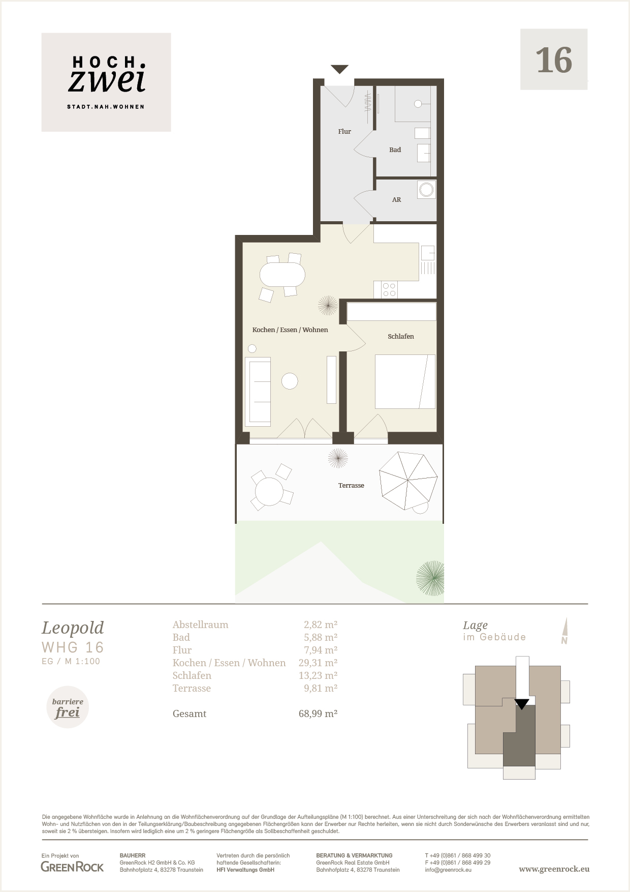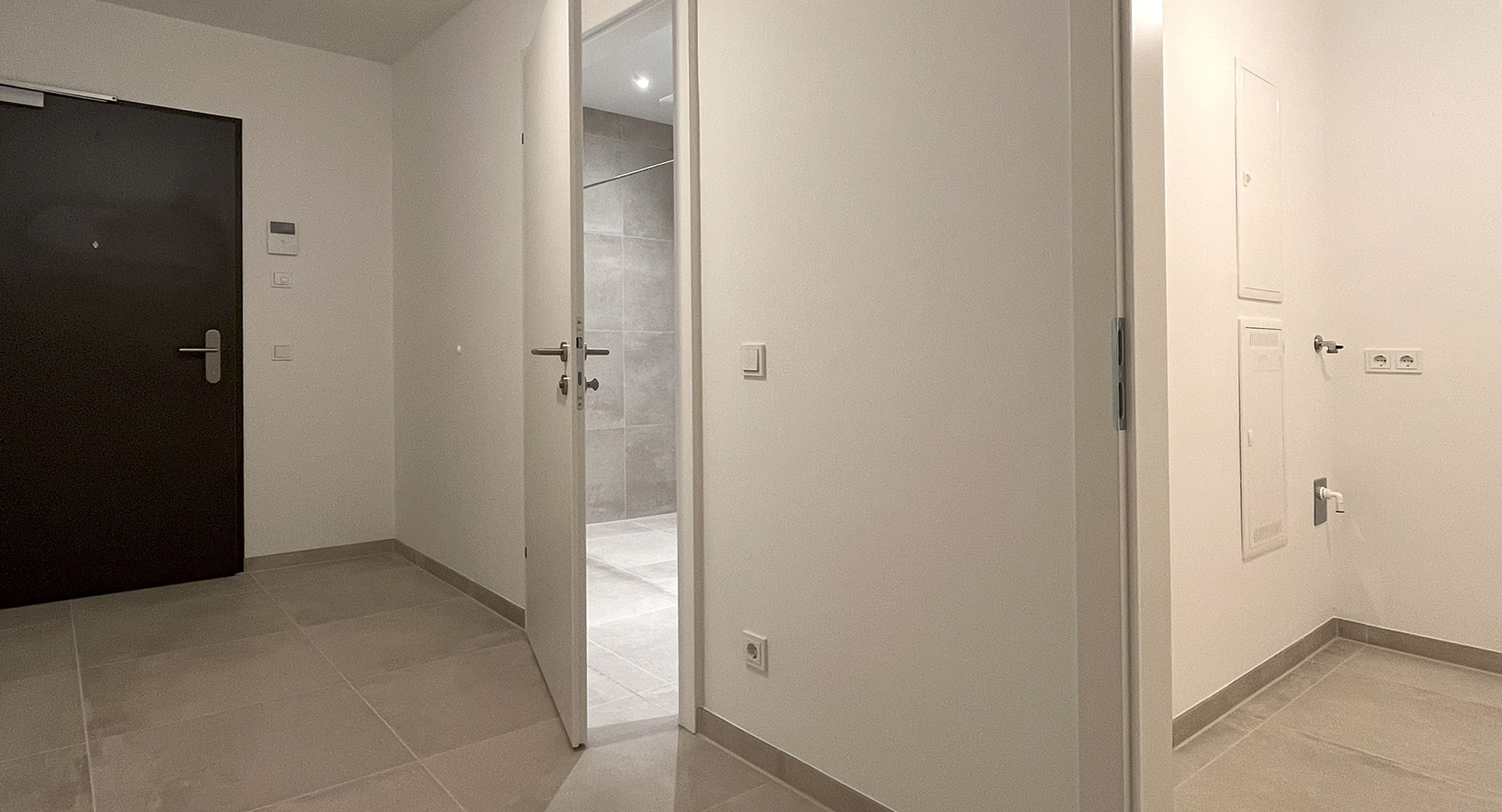 Die barrierefreie 2-Zimmer-Wohnung im Erdgeschoss bietet mit 69 m² einen funktionalen und zugleich komfortablen Grundriss. Der offene Wohn-, Ess- und Kochbereich bildet das Zentrum der Wohnung und öffnet sich zur großen Terrasse, die zusätzlichen Raum für Erholung im Freien schafft. Das Schlafzimmer ist gut geschnitten und ermöglicht eine flexible Möblierung. Ein modernes Bad, ein separater Abstellraum sowie ein einladender Flur ergänzen die Ausstattung. Die Wohnung eignet sich ideal für Singles oder Paare, die ruhiges Wohnen mit praktischer Nähe zu allen wichtigen Einrichtungen verbinden möchten.